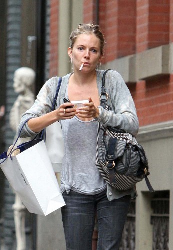 I think that Sienna Miller is adorable, although I have never seen her in any movies and I have heard rumors that she is a husband stealer (I’m against that just for the record). She is on my don’t list …not for her hair, makeup or clothes but what’s in her mouth….It’s a cigarette. I know millions upon millions smoke but it’s an ugly habit. It can give you cancer, speed up the aging process (HELLO — Wrinkles), it makes you stink (your hair, clothes, furniture, everything, kids) and there are many more reasons not to smoke. So please Don’t Smoke.