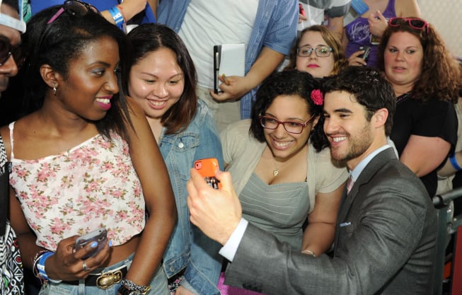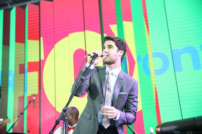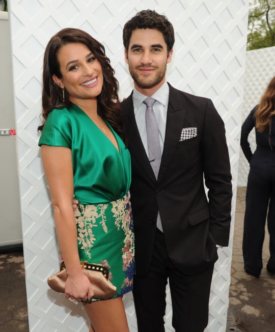 Lea Michele showed off her toned legs in an emerald green Blumarine dress at the 2014 Fox FanFront Presentation Event. Michele was joined by Glee co-stars Chord Overstreet and Darren Criss, who performed for the fans. Glee will return for a sixth and final season in 2015.