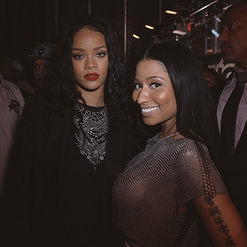 Rihanna and Drake splitting up may have just been a rumor because the Bajan beauty was spotted backstage at the Hot 97 Summer Jam concert in NYC…but she never took the stage. Sounds like a good girlfriend to me! Rihanna even took a snap shot with Nicki Minaj who took the stage with Lil Wayne and Champagne Papi himself, Drake.